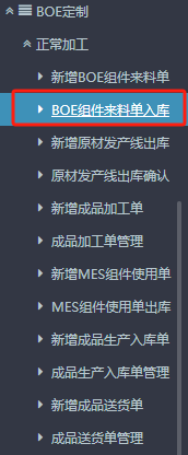 点晴ERP-BOE组件来料单流程 1.进入ERP系统之后,在左侧的功能菜单里下方可以找到“BOE定制”,点击后找到“正常加工”。然后点击打开“新增BOE组件来料单”。 2.进入“新增BOE组件来料单”界面后,先填写好基本的信息:入库仓库、收货日期。以及有需要的话可以根据情况填写来料的备注信息。3.填写BOE组件来料...