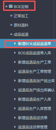 点晴ERP-BOE返退品生产工单流程 1.进入ERP系统之后,在左侧的功能菜单里找到“BOE定制”,点开“成品返退”,点击“新增返退品生产工单”。 2.进入界面后,按图操作:选择订单来源,备注有需要可补充。 3.接下来在下方找到“货品编码”点开,会有物料信息弹窗。 在弹窗的信息窗口内,按图操作:点击选择物料...