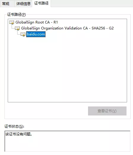 可以看到百度是受信于GlobalSign G2,同样的GlobalSign G2是受信于GlobalSign R1,当客户端(浏览器)做证书校验时,会一级一级的向上做检查,直到最后的根证书,如果没有问题说明服务器证书是可以被信任的。那么客户端(浏览器)又是如何对服务器证书做校验的呢,首先会通过层级关系找到上级证书,通过上级证书里的公钥来对服务器的证书指纹进行解密得到签名(sign1),再通过签名算法算出服务器证书的签名(sign2),通过对比sign1和sign2,如果相等就说明证书是没有被篡改也不是伪造的。