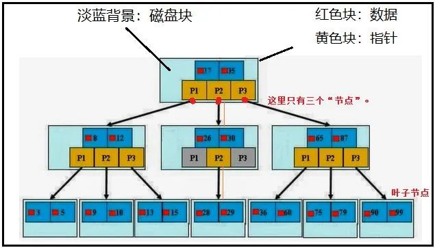 那么对于第1、2层中的数据又是干嘛的呢?答:用于分割指针块儿的,比如说小于26的找P1,介于26-30之间的找P2,大于30的找P3。