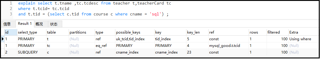 explain select * from teacher where tname ='' and tcid >1 ;