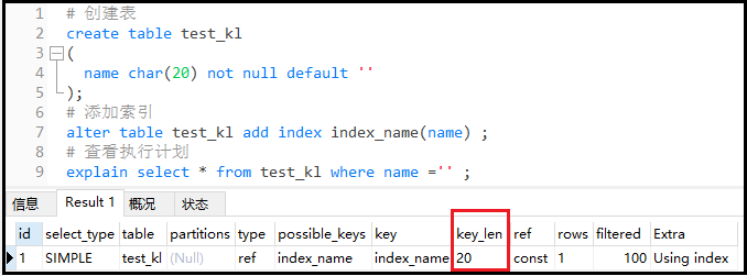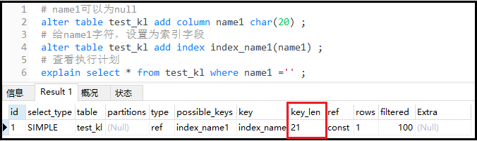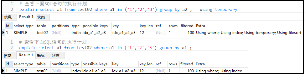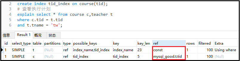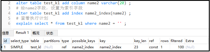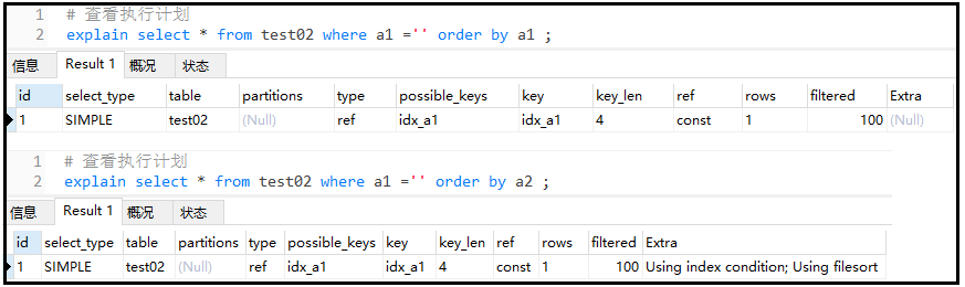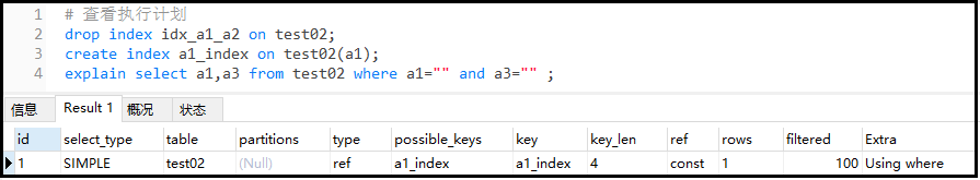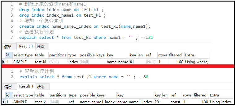 结果分析: 我们创建了两个索引,但是实际上只使用了一个索引。因为对于两个单独的索引,程序觉得只用一个索引就够了,不需要使用两个。