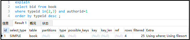 explain select * from book where authorid*2 = 1 and typeid = 2 ;
