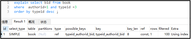 explain select * from book where authorid = 1 and typeid =2 ;