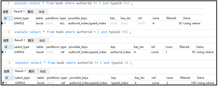 explain select * from book where authorid != 1 and typeid !=2 ;