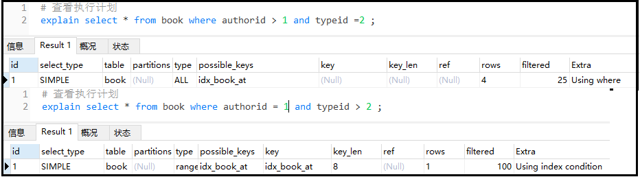 explain select * from book where authorid = 1 and typeid > 2 ;