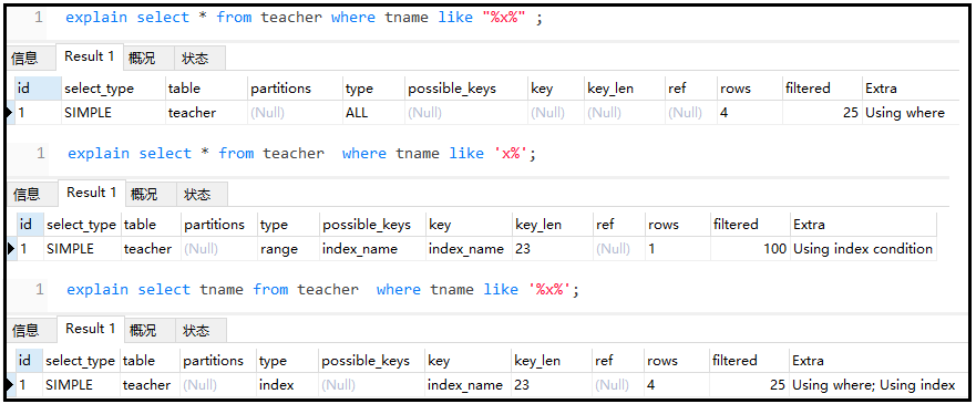 explain select * from teacher  where tname like 'x%';