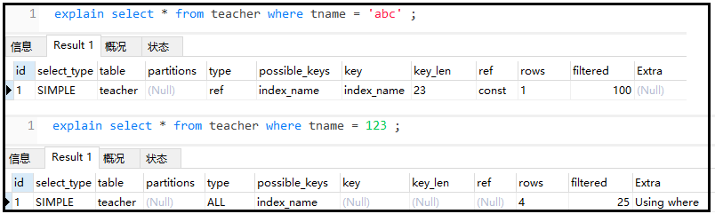 explain select * from teacher where tname = 123 ;