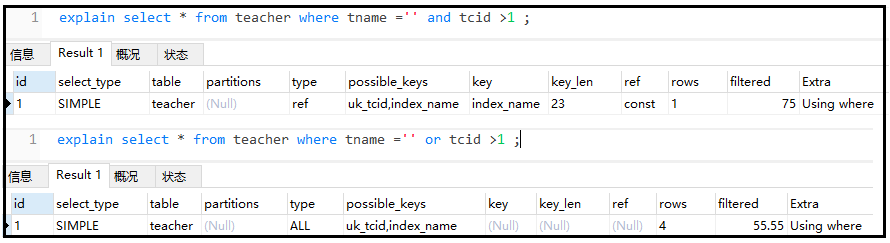 explain select * from teacher where tname ='' or tcid >1 ;