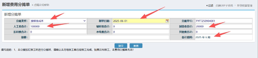 做费用分摊操作,每月填写一次,填入人工以及制造费用