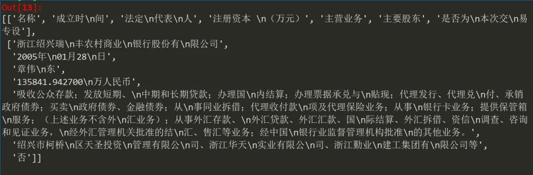可以看到在上述中是存在\n这种没不要的字符,它的作用其实是换行但我们在Excel中是不需要的。所以需要剔除它,用代码中的for循环与replace函数将控制替换成空格(即删除\n)。观察table是一个装有2个元素的列表。