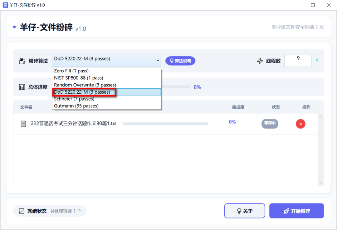 提供6种粉碎算法,日常使用选择DoD就够了,如果你有隐私焦虑,就选择Gutmann,开始粉碎前后悔了,可以点击移除项取消。