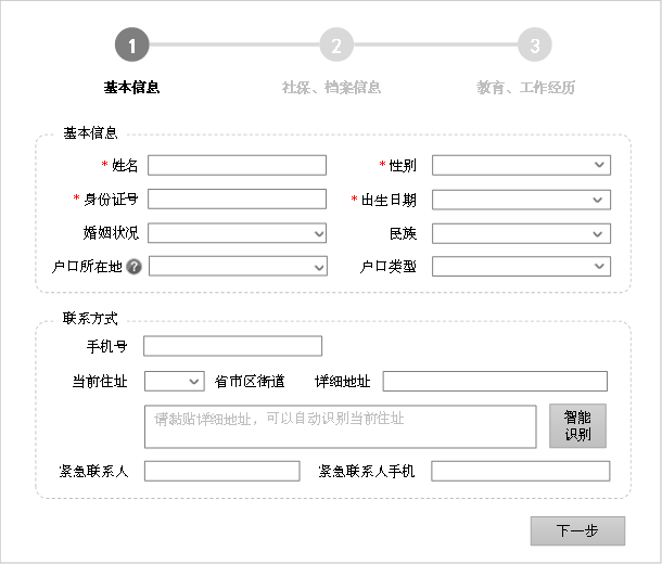 通过这几个思路,我们尝试对土豆入职时遇到的表单页面进行优化。先将页面拆解成三个步骤,分别录入基本信息、社保档案信息、教育工作经历,如图7-x。