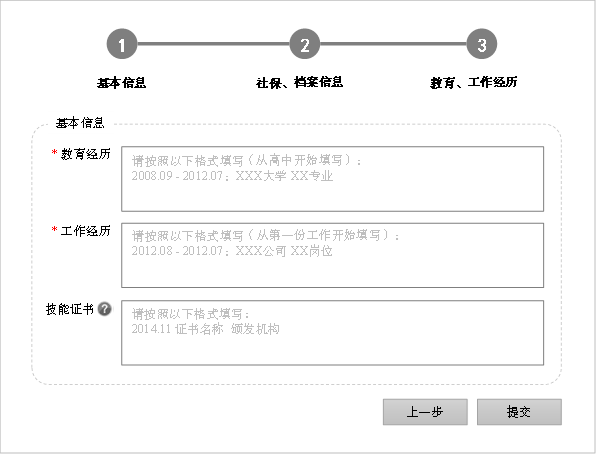 在教育经历、工作经历的文本框中,用淡灰色文字做了格式要求的示意,这并非强制要求,但通过提示,希望用户尽量能按照清晰地逻辑结构描述相关信息,否则用户填写的方式,绝对五花八门。