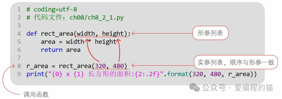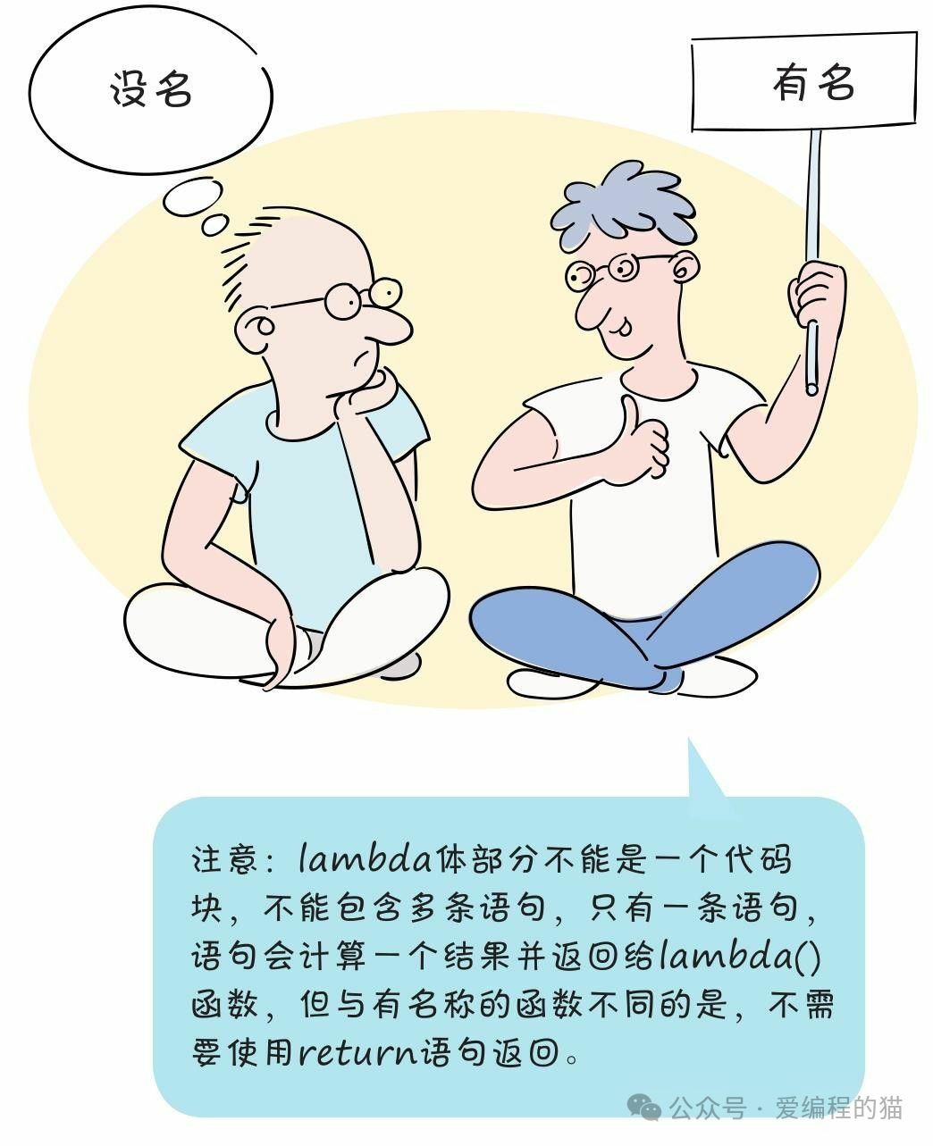 我们之前学习的函数都是有名称的函数,例如在8.1节定义的rect_ar ea()函数,rect_area就是其函数名。我们也可以定义匿名函数,匿名 函数就是没有名称的函数。