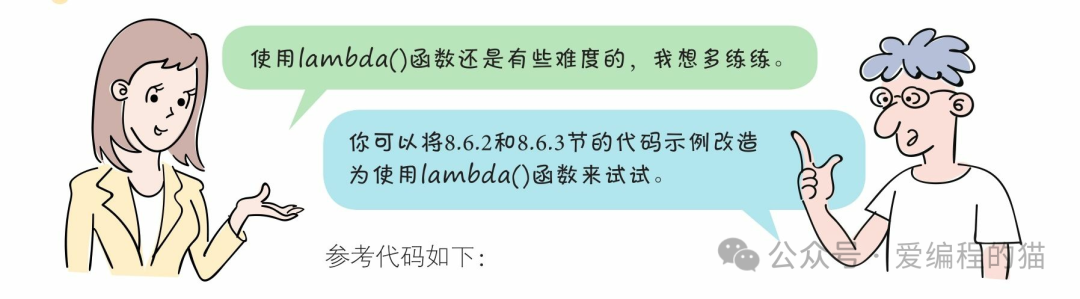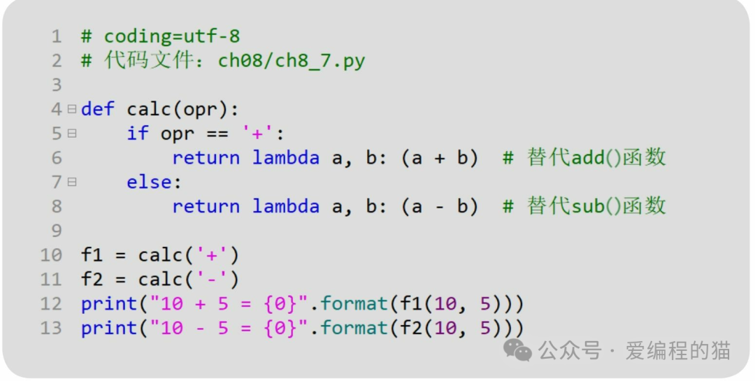 lambda()函数与有名称的函数一样,都是函数类型,所以8.6.1节 的add()和sub()函数可以被lambda()函数替代。修改8.6.1节的代 码示例如下: