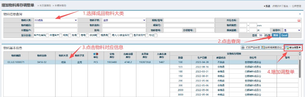 2.进入界面后,按图操作:物料大类选择成品,点击查询。然后点击对应物料信息,点击增加调整单