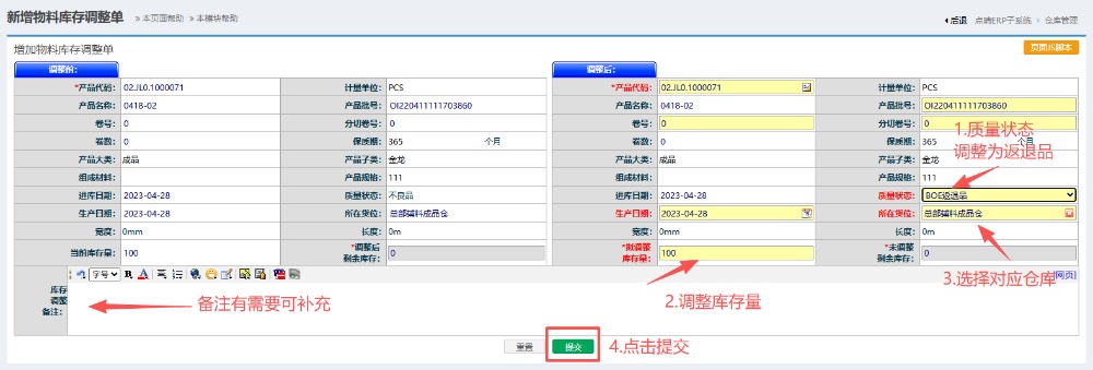 在调整单界面内,按图操作:质量状态调整为BOE返退品调整库存数量以及选择对应的仓库。最后点击提交