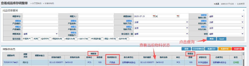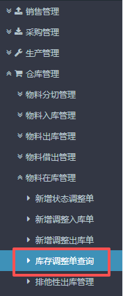 3.提交后可在“库存调整单查询”里找到对应的物料状态。