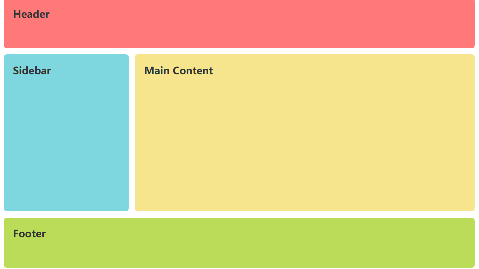 .container {            display: grid;            /* 定义网格区域:第一行是header,最后一行是footer,中间一行左边是sidebar,右边是main */            grid-template-areas:                "header header"                "sidebar main"                "footer footer";            /* 定义列:侧边栏200px,主内容区自动填充剩余空间 */            grid-template-columns200px 1fr;            /* 定义行:Header和Footer高度固定,中间部分自动填充剩余空间 */            grid-template-rows80px 1fr 80px;            height100vh;            gap10px;            padding10px;            box-sizing: border-box;        }        /*grid-area是项目属性,指定项目放在哪一个区域。一般搭配grid-template-area使用 */        .header {            grid-area: header;            background-color#ff7979;        }