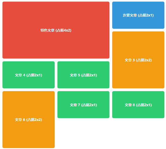 /* 通用项目样式 */        .magazine-layout > div {            padding20px;            border-radius8px;            color: white;            font-weight: bold;            font-size1.2rem;            display: flex;            align-items: center;            justify-content: center;        }    </style>    <div class="magazine-layout">        <div class="featured">特色文章 (占据4x2)</div>        <div class="secondary">次要文章 (占据2x1)</div>        <div class="tertiary tall">文章 3 (占据2x2)</div>        <div class="tertiary">文章 4 (占据2x1)</div>        <div class="tertiary">文章 5 (占据2x1)</div>        <div class="tertiary tall">文章 6 (占据2x2)</div>        <div class="tertiary">文章 7 (占据2x1)</div>        <div class="tertiary">文章 8 (占据2x1)</div>    </div>