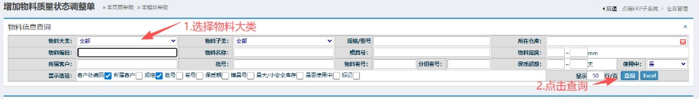 2.进入界面后,按图操作:先选择物料大类,然后点击查询