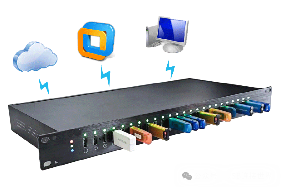 把需要共享的所有USB设备,像图书馆藏书一样,集中插进一台叫USB服务器的专用设备中。它是所有设备的总插座。