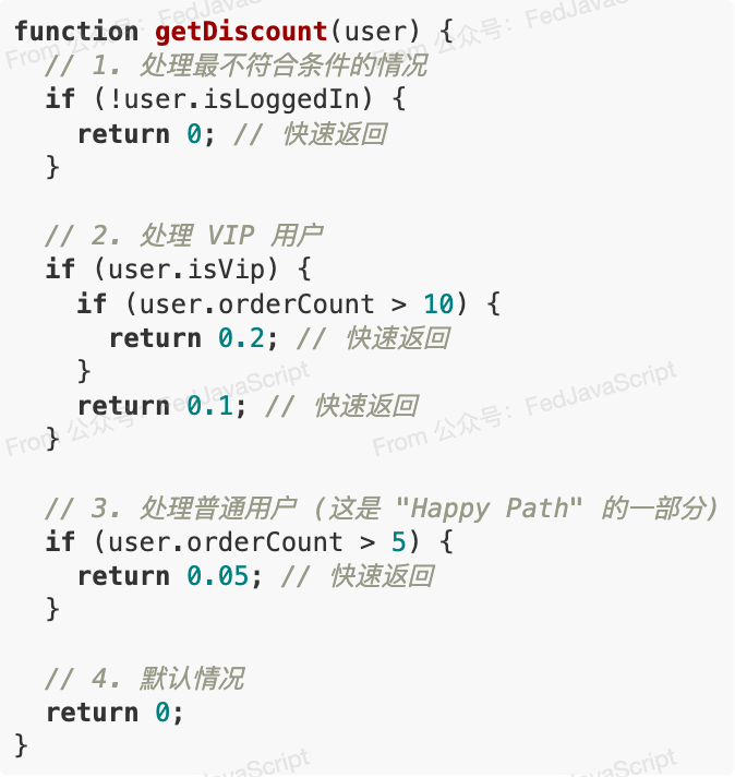 4. 可维护性增强:当我们需要增加一个新的条件(比如“黑名单用户”),我们只需在函数的开头添加一个新的卫语句即可,而无需在复杂的 else 嵌套中找到正确的位置。