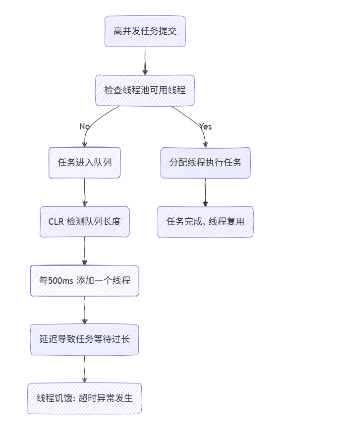 1. 负载突发:高并发时,初始 MinThreads 太小,无法立即应对。CLR 的 500ms 增长延迟会放大问题。