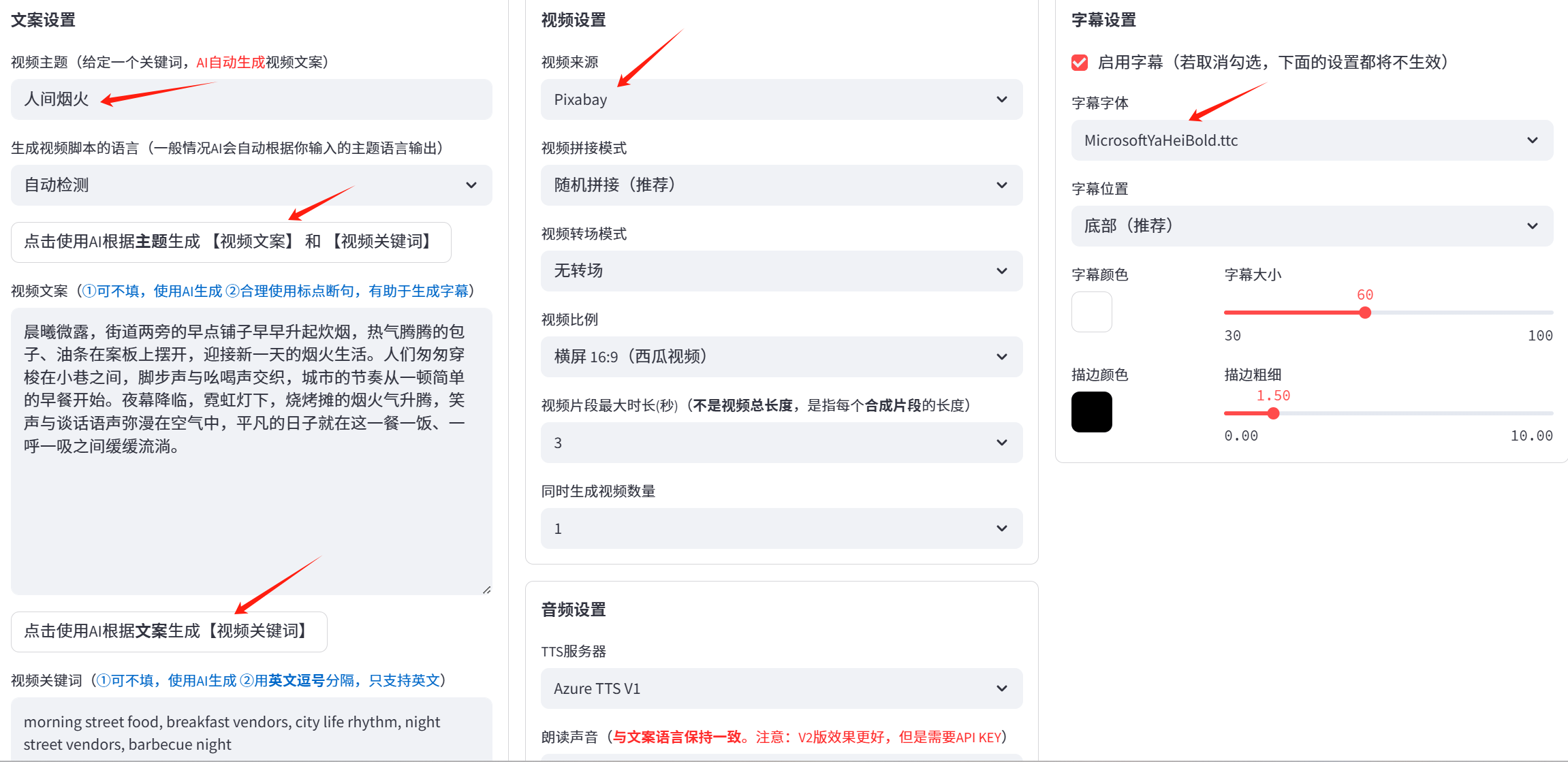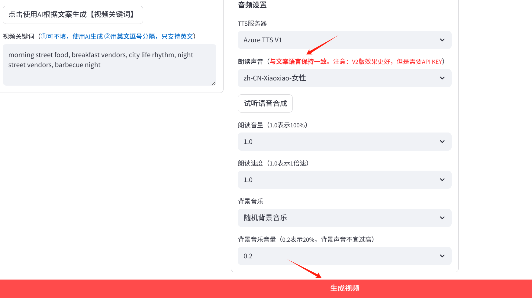 视频文案:这里直接AI生成,你可以手动输入。最好还是AI生成,自然一点。