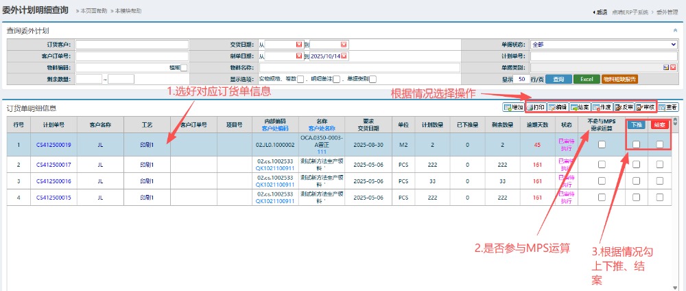 3.在下方会显示对应订货单信息,选好对应订货单信息,根据情况选择对应操作(打印、审核、编辑等)以及是否参与MPS运算,然后在点击勾上下推或者结案