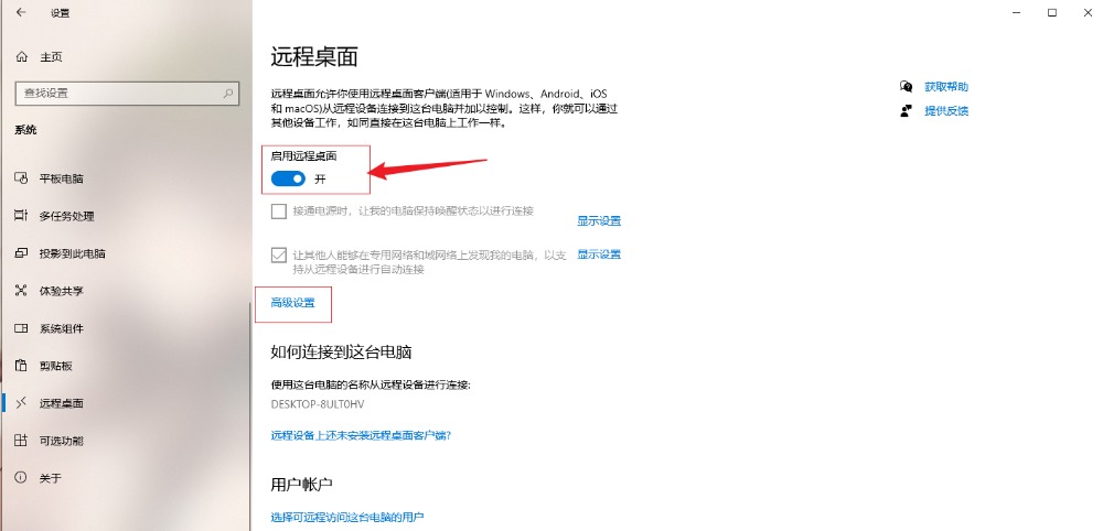 以win 10为例,首先打开windows设置界面,找到远程桌面设置,开启远程桌面开关,开启后再点击高级设置