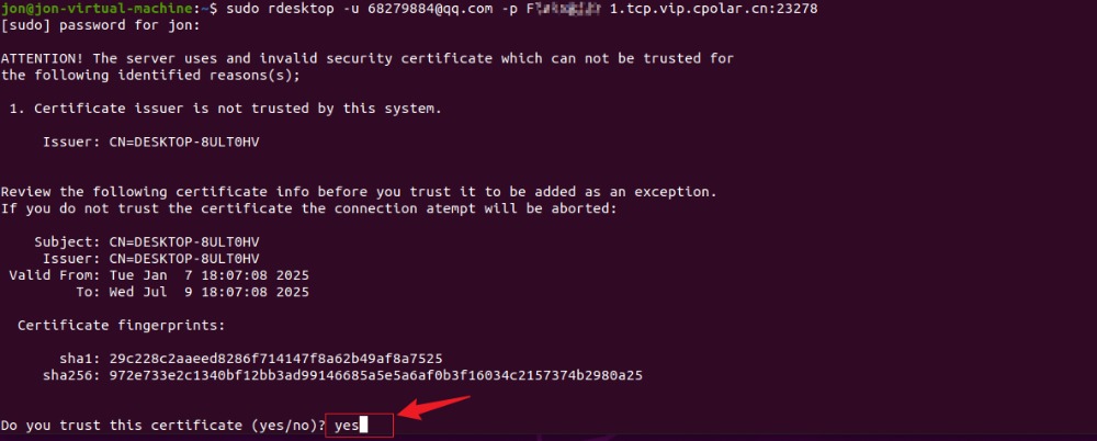 固定好了地址后,转到Linux ,输入rdesktop命令,使用cpolar固定地址连接,输入完成点击回车,出现提示我们输入yes