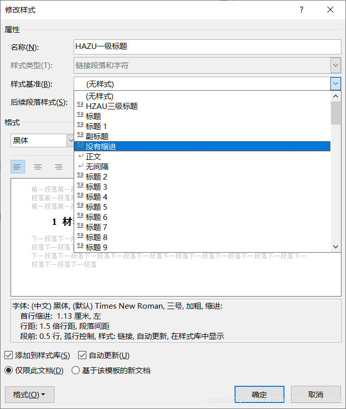 然后将一级标题的“样式基准”修改为新建的“没有缩进”。
