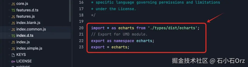 这是为了兼容 UMD 模块,即在浏览器通过 <script> 直接引入时,可以挂载到全局变量 window.echarts 上。这样我们在代码里就能直接写: